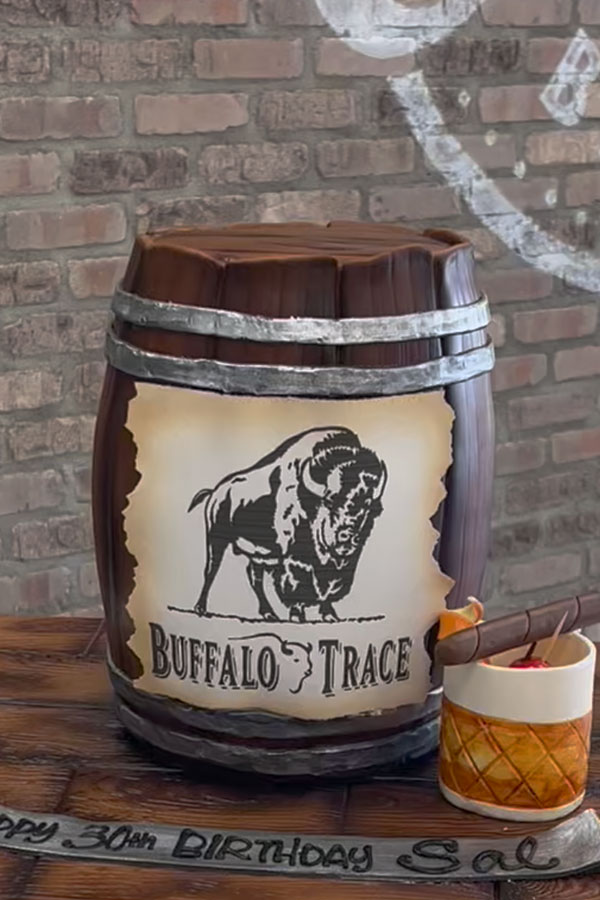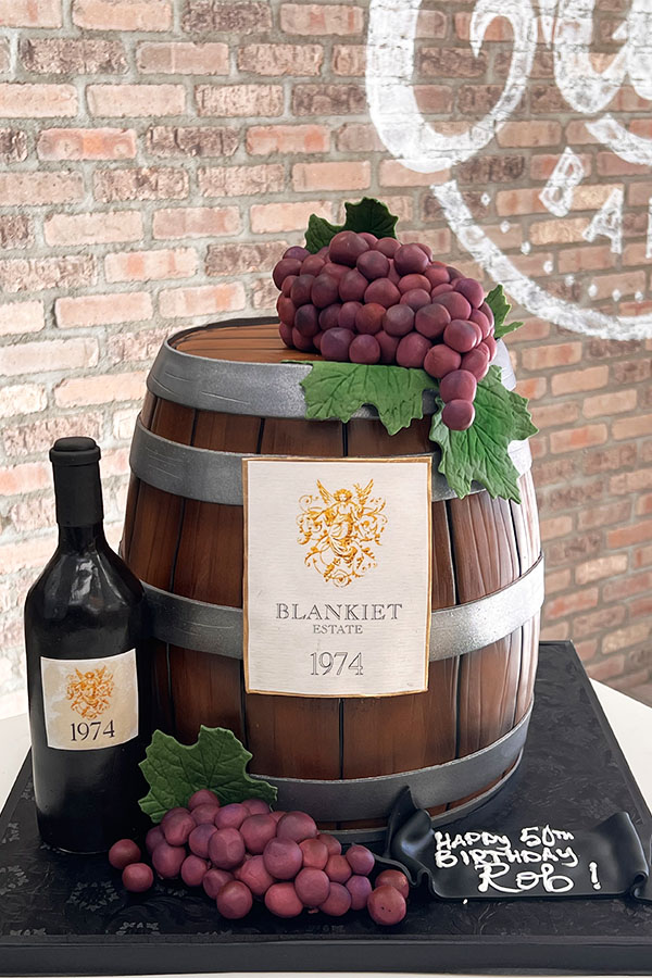 A hand sculpted rustic wine barrel cake and a sculpted bottle of wine, perfect for the ultimate wine lover’s celebration.